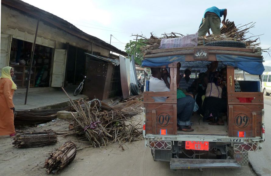 Dala-Dala back to Stone Town. This time, sat in the back like everyone else. They had to chase 2 kids off the seat (down to floor) in order to squeeze us in. Still at each subsequent stop, people kept piling in, until I couldn't move a millimeter, the floor was also packed with people, 4 guys hanging on the back. Maybe totaled ~30 in this truck. Eventually, people started getting off. The boy who collects ticket (Tsh2000, kids less) climbed to the roof to toss down luggage. A surprising number of them carry bundles of firewood. A CLOSE encounter with the locals. Quite a few of these wear beautifully embroidered scarves, and speak excellent English.