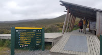 Turangi just past 1am (bus was half an hour late)! Walked to the hostel. Mike, the owner was heading out to the bus station to pick us up, when we showed up in his drive way. Wow! He said we should sleep late tomorrow, and he'll take care of the shuttle to the TH. I got up early still, worried that I would miss the shuttles, which usually depart early morning. Checking out the hostel. A Plus Samurai Hostel is a hodgepodge of multiple 1 story buildings. Messy, but has character: cars parked on grass, childish paintings and slogans on walls, flags on the ceiling, mismatch furnitures with torn or stained upholstery, miscellaneous decorative items (like a rock). Lots of people, especially in the kitchen and living room. Everyone seems to be comfortable. These boots hanging here are supposed to have not survive the hike. At around 10am, Mike took us and 2 young trampers south. Dropped them off at some road junction, and drove us all the way to trail head. Saw a few cars parked way out. Must be very crowded yesterday. It was sunny. Now, the thick clouds are hanging low. At this hour (10:47), not many people on the trail. He said he'd pick us up at 6:30pm.
