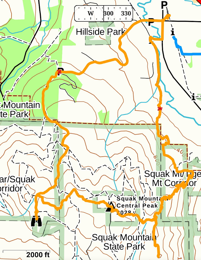 4/18, Saturday, a bit rainy in the morning. I headed out after lunch to Issaquach again. This time, trying Squak Mt, which is crossing the street from West Tiger (where I went last weekend). More road walk. I did this loop from the town center, about 9.7 miles, 2800' EG according to Gaia (1/3 is walking on road, 1/3 is old logging road -- so very gentle grade). Very boring. No wonder I never came here before.