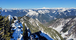 No snow for the first 1/4 mile. Then, we put spikes on. The trail follows Surprise Creek south, and cross it ~1 mile in.